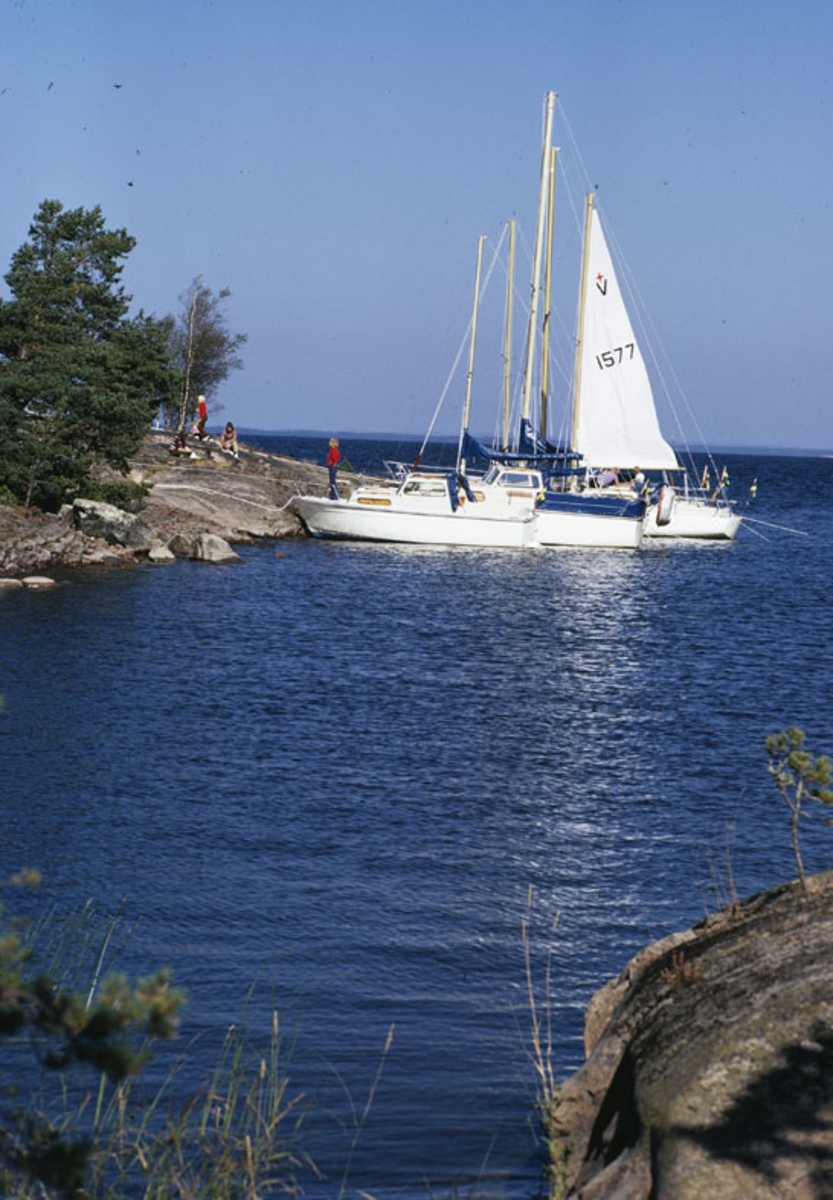 Titel: Albin-båtar förtöjda vid holme. Marknadsföringsbild.