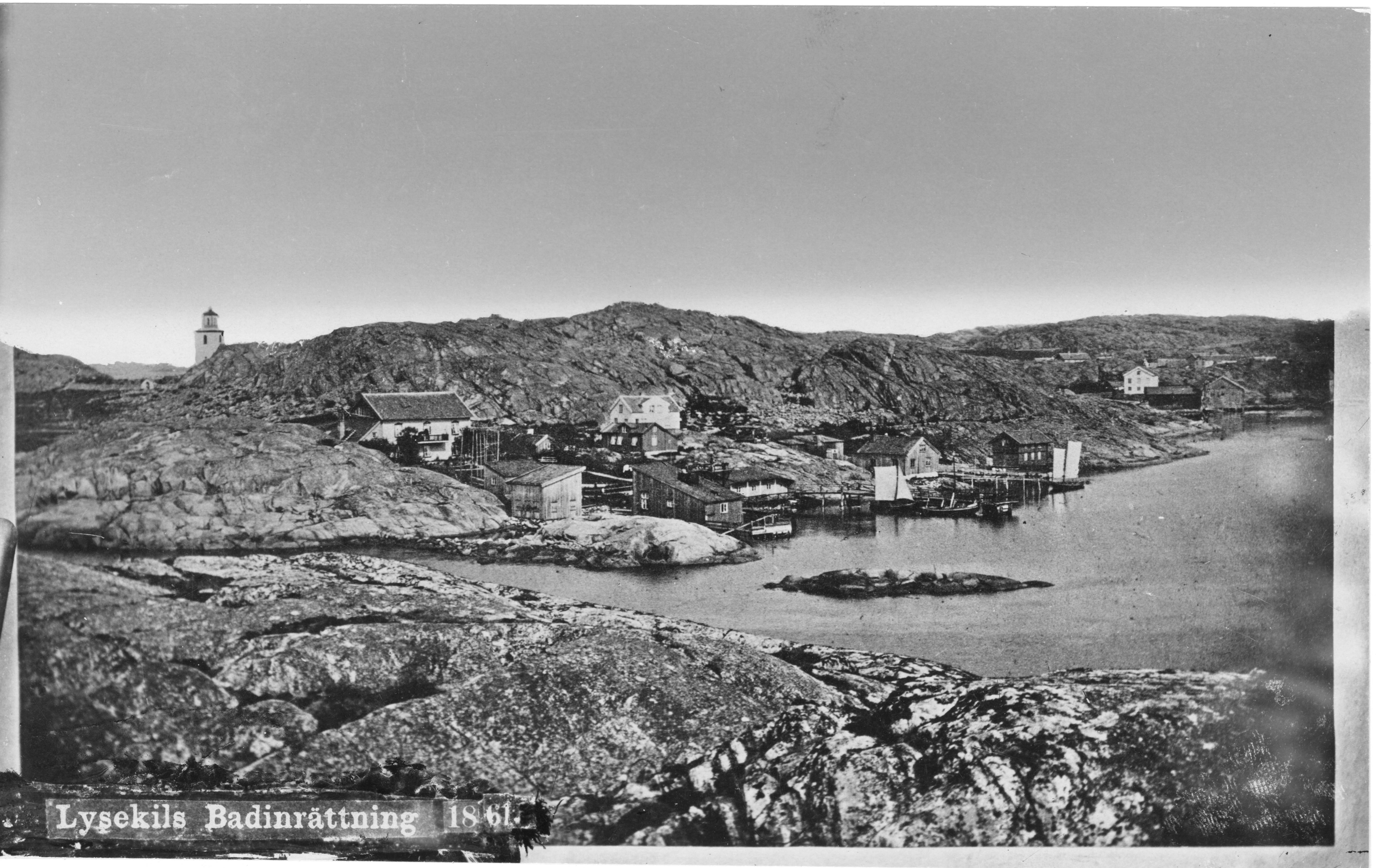 "Lysekils badinrättning". Bilden är tagen från Släggö på den första badanläggningen i Lysekil från 1846 grundad av Consul John Gabriel Mollén. Det första badhuset som syns mitt i bilden vid vattnet, byggdes av ruffen från det förlista fartyget Triton. Det var ett varmbadhus med endast två badrum. Till vänster i bild ser man tornet på den gamla kyrkan.