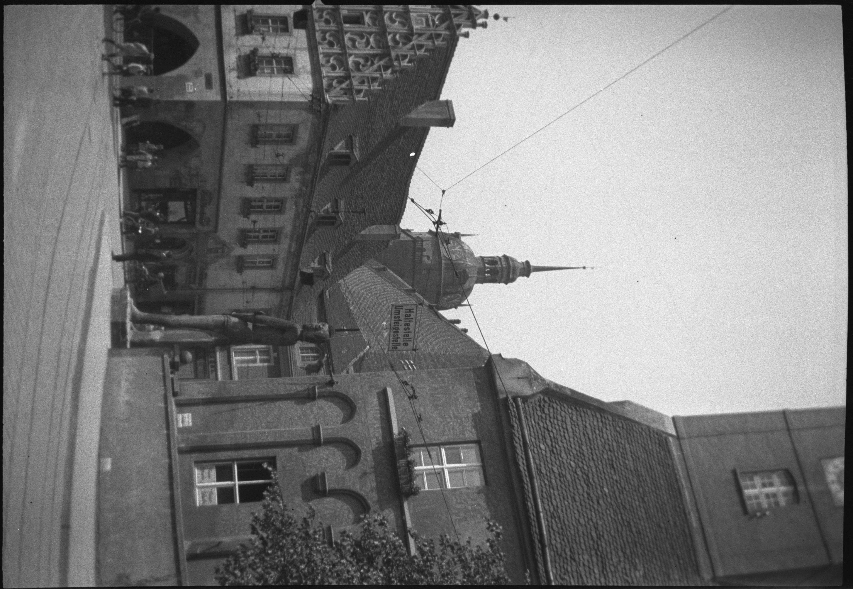 Kurfürstenhaus till vänster och Neustädtische Rathaus (nya rådhuset) till höger, vid Hauptstrasse. I bakgrunden tornet till kyrkan Sankt Katharinen. Staty av riddare Roland vid hörnet av rådhuset.