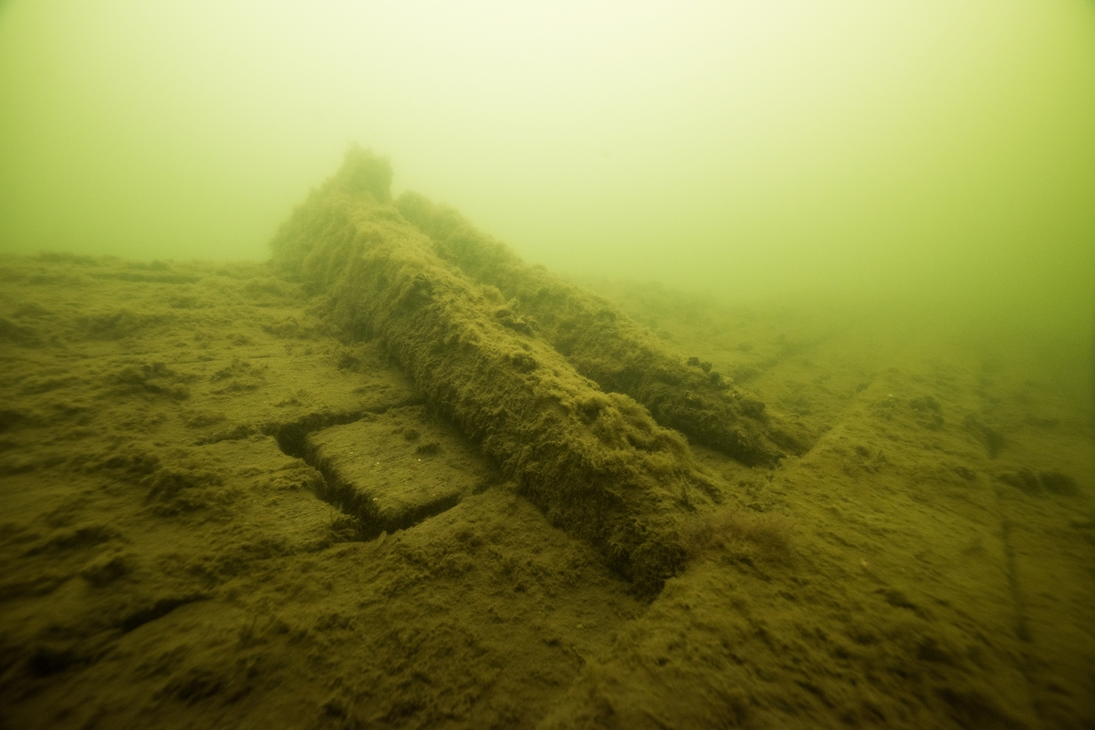 Skrovsidan med spant, bordläggning och innergarnering på fartygslämning ID 12.