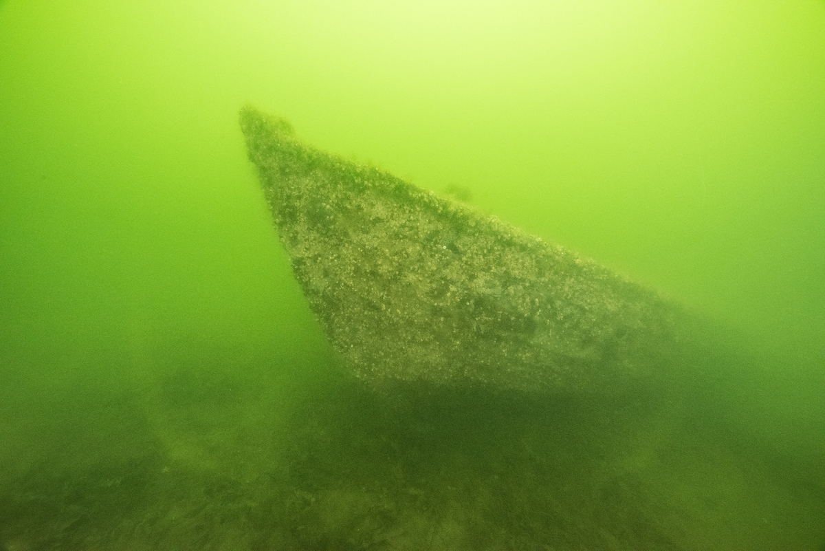 Fartygslämning efter en liten modern klinkbyggd segelbåt i trä, ID 9. Fören sedd framifrån.