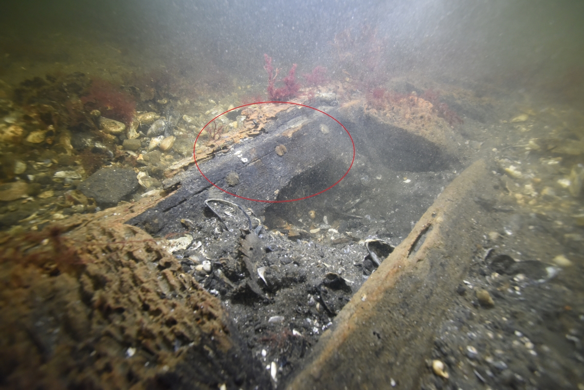 Foto av insidan av fartygslämning ID44-2, där små trädymlingar med kil i bordläggningen syns.
