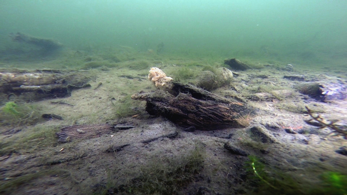 Bilden visar hur lite av vraket, som visar sig ovan havsbotten. Timret mitt i bilden är en bottenstock (RAÄ Nacka 275). (Svindersviken, Nacka).