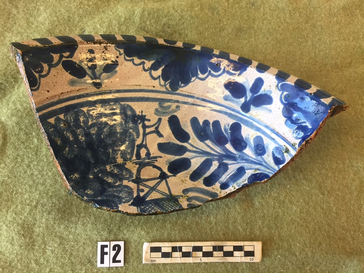 Skål med invändig vit tennglasyr och blå dekor, antagligen från 1700-talet. Möjligen tysk tillverkning då leran är mer ljusbrun än röd. (RAÄ Stockholm 206:1).