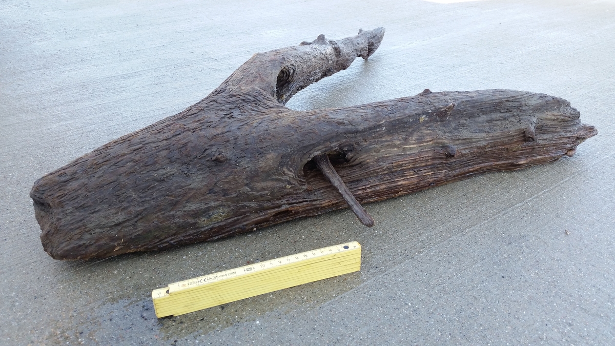 En bottenstock (bottenspant) som påträffades löst liggandes på botten nära gästbryggan. Notera det genomgående hålet och den eroderade dymlingen (träpluggen).