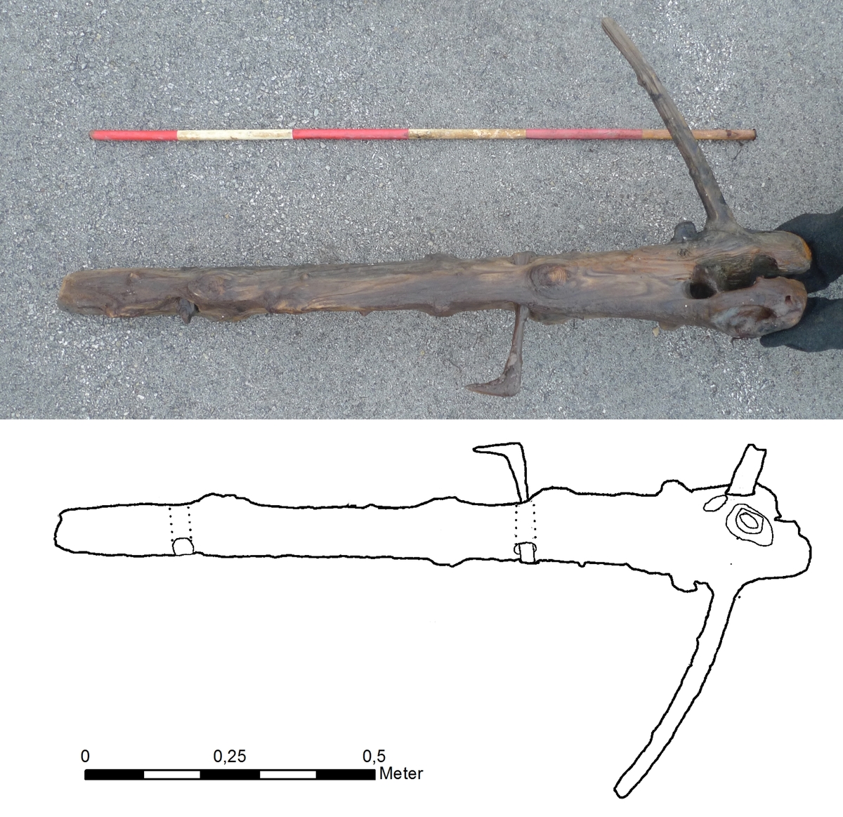 Foto och skiss av träankaret som påträffades inom utredningsområdet och som bärgades för dokumentation och provtagning.