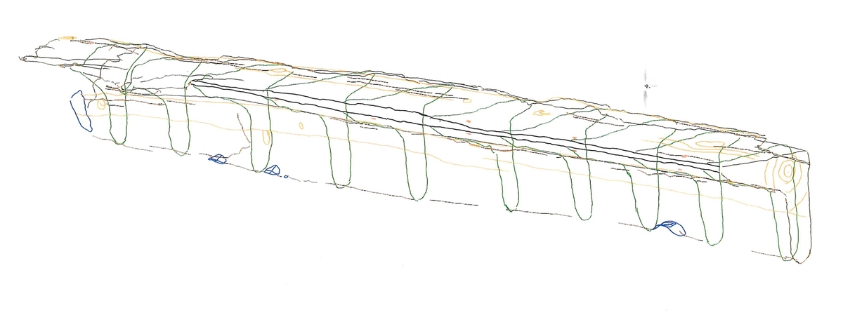 Faro arm-ritning av en del av kölen (318c). Notera det T-formade tvärsnittet samt de dymlingarna i kölens nederkant. Köldelen mätte 140×25×25 cm.