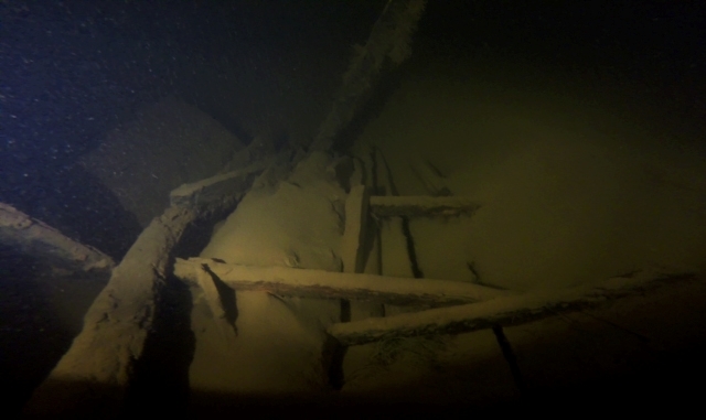 Förparti och förstäv på fartygslämning i Luleå hamn. (ID16).