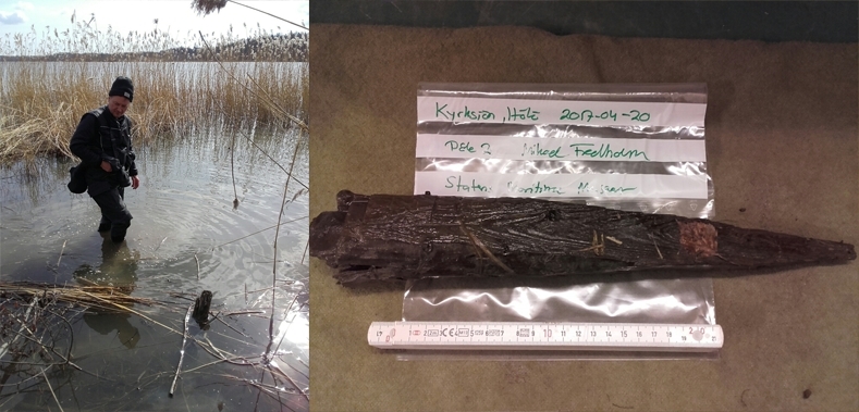 Pålar vid åmynningen i Kyrksjön. Ovan påle 1 in situ och nedan en del av påle 2.