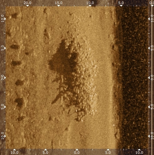 Sonarbild på stenkista/bro Id 13, som är cirka 12 m lång.