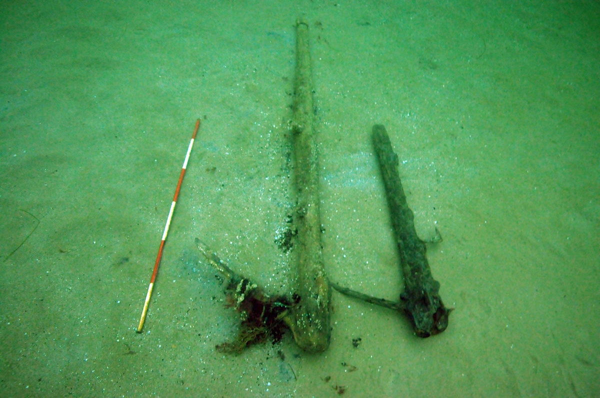 Till vänster träankaret som satt fast i stockankaret. Till höger träankaret som påträffades inom utredningsområdet.