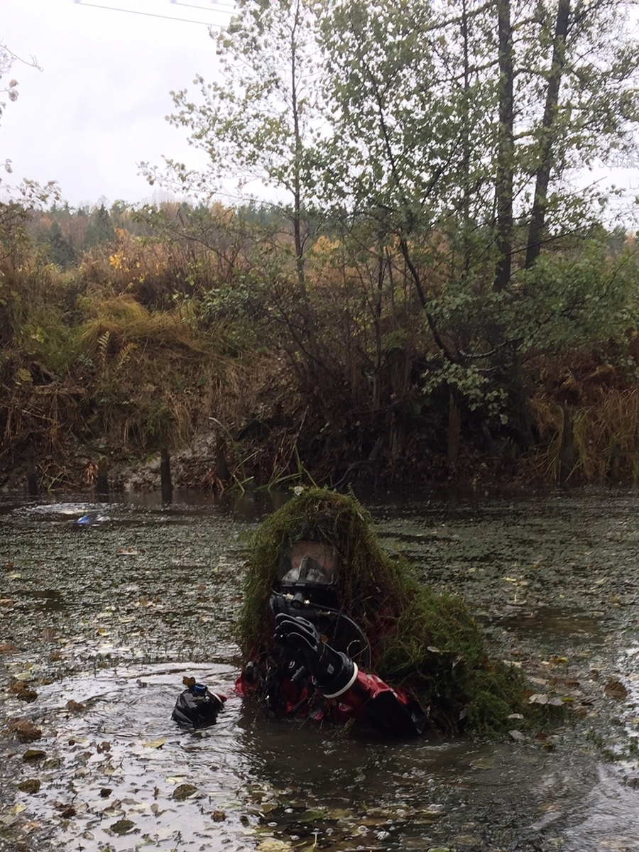 Mikael Fredholm tittar upp genom Trosaåns sjögräs.