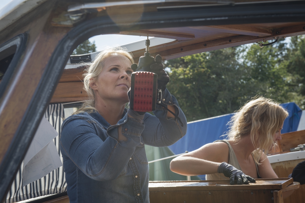 Företaget Båtskroten demonterar och skrotar en äldre plastbåt.