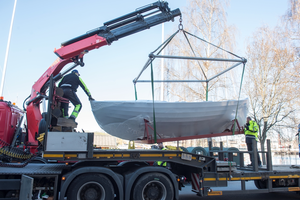 Transport av fritidsbåtar från Båthall 2 till Fritidsbåtsmuseet i Härnösand.