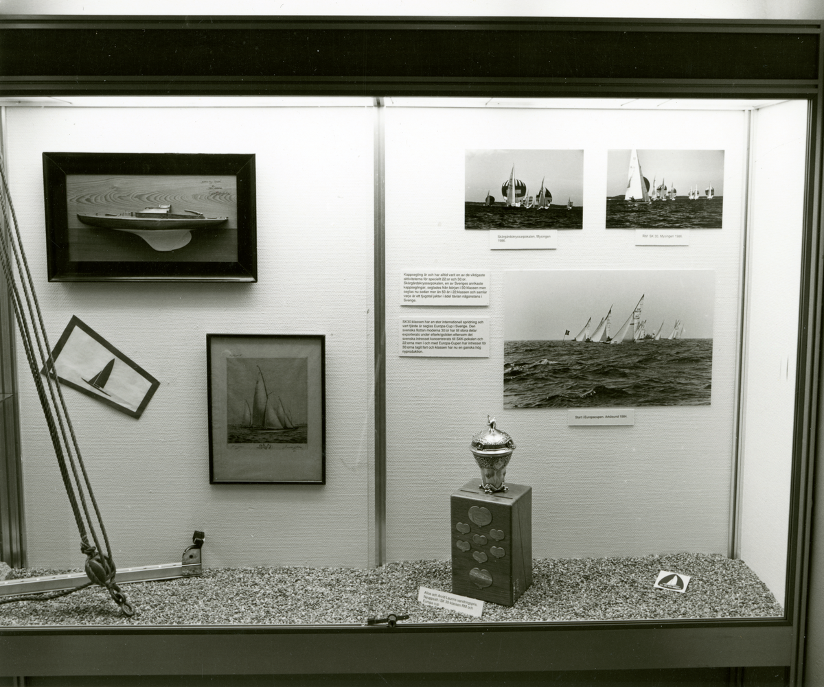 Utställningen Svenska Skärgårdskryssare Förbund presenteras i trappmonter. Del av montern som visar kappsglingen och Alice och Arvid Laurins vandringspris i SK 30-klassen RM och Europa cup. Även klubbens vimpel.