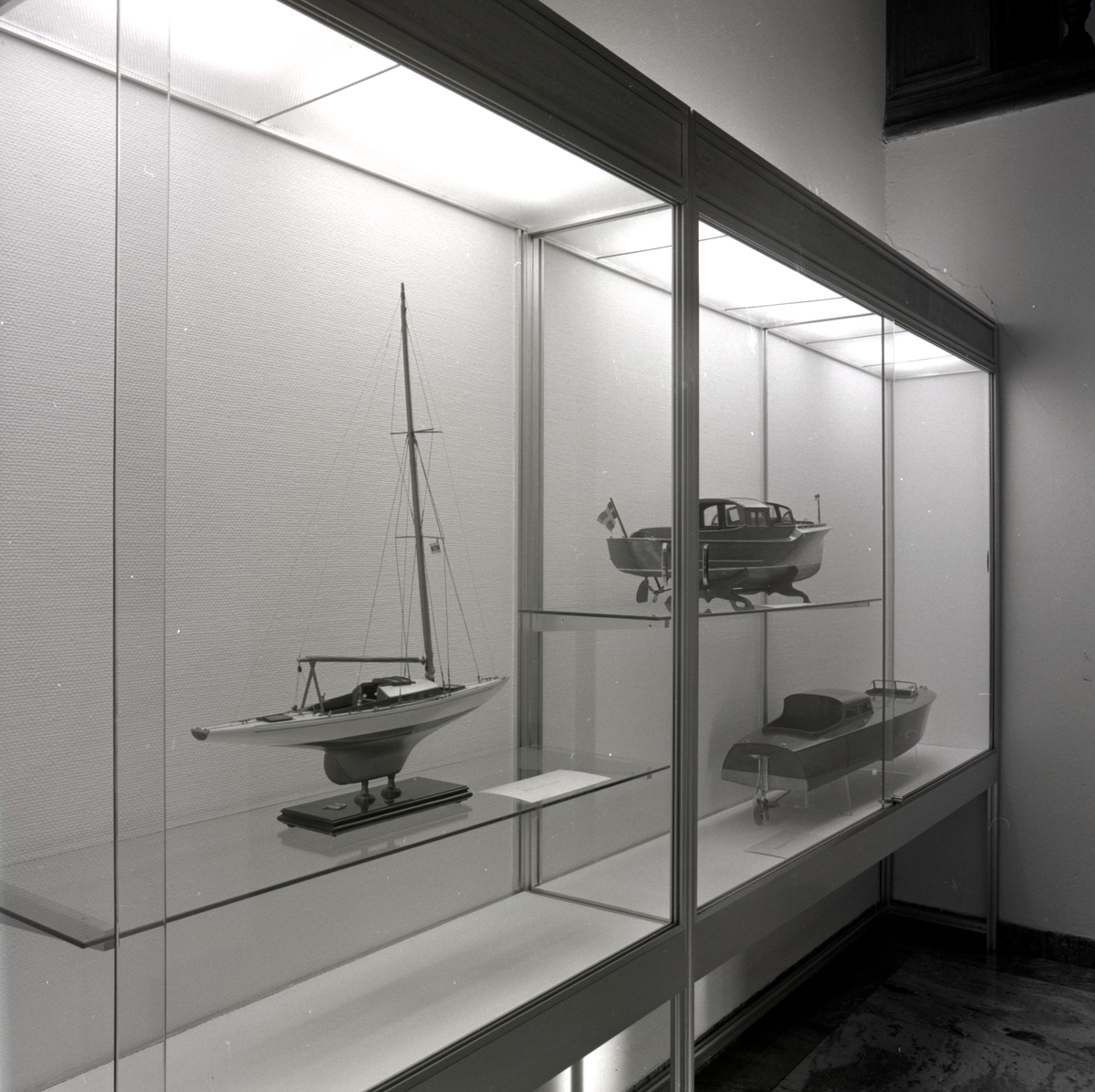 Utställning i trappmonter med fartygsmodeller av en sgelbåt och två mahognyracers.