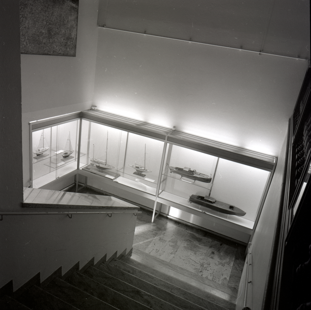 Utställning i trappmonter med fartygsmodeller t.ex. VEGA, FOLKBÅT och mahognyracers. Överblicksbild.