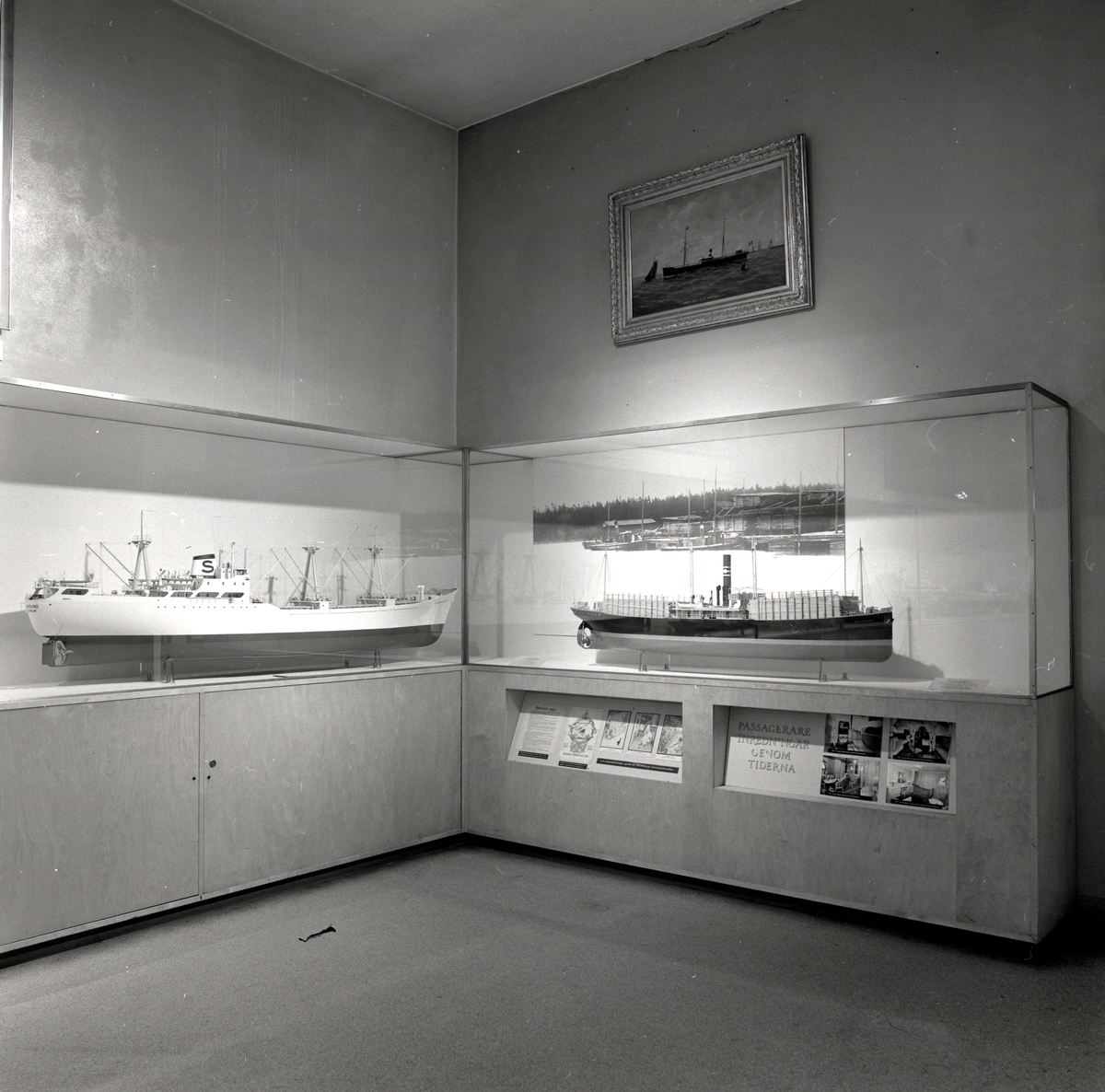 Permanent utställning i Rederisalen innan den bröts upp 1974. Överblick av utställningsinteriör.