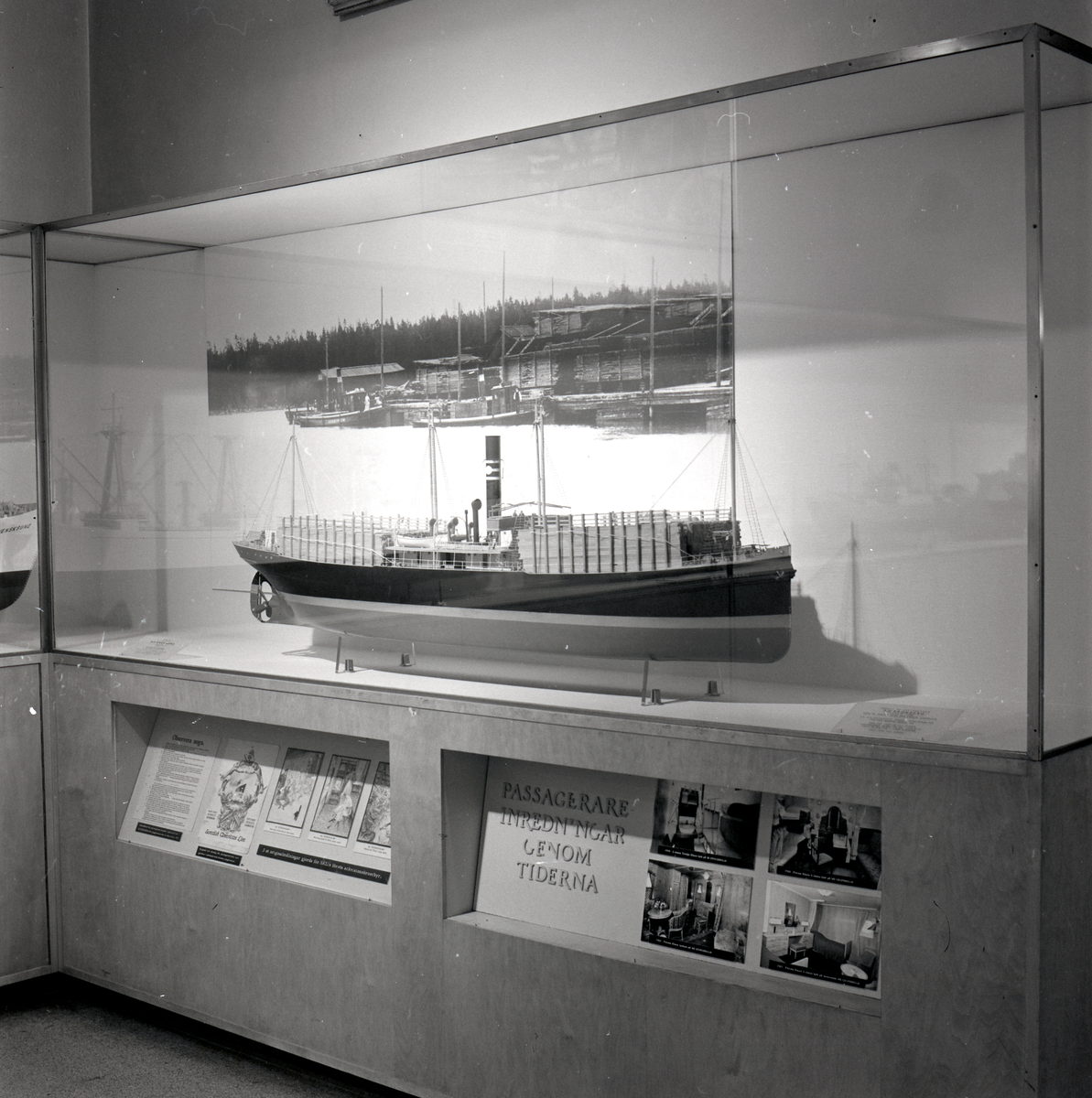 Permanent utställning i Rederisalen innan den bröts upp 1974. Överblick av utställningsinteriör.
