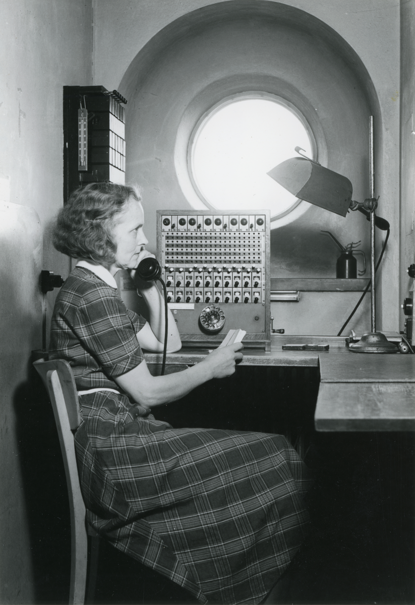 Arkivarbetare Anna-Lisa Lundström i färd med att koppla museets telefonväxel 1952. Ur dokumentation av personalfotografier, SSHM.