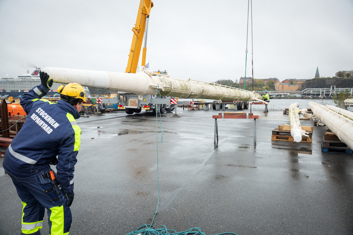 HMS Af Chapman, (vandrarhem) i docka, Beckholmen. Renoverar riggen.