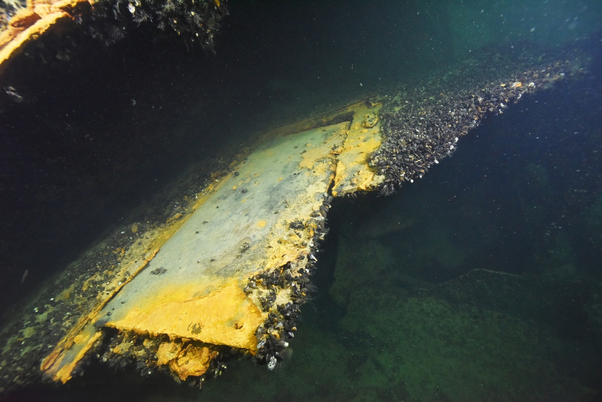 Skrovplåtar som fläkts ut, på styrbords sida i förpartiet på Princess.