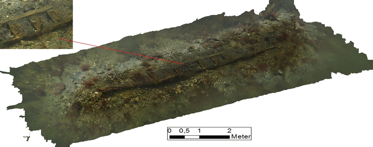 Fotogrammetri av fartygslämning ID44-2. Infogad förstoring visar en cirka 6 m lång sektion med tre synliga bottenstockar, bordläggning och innergarnering.