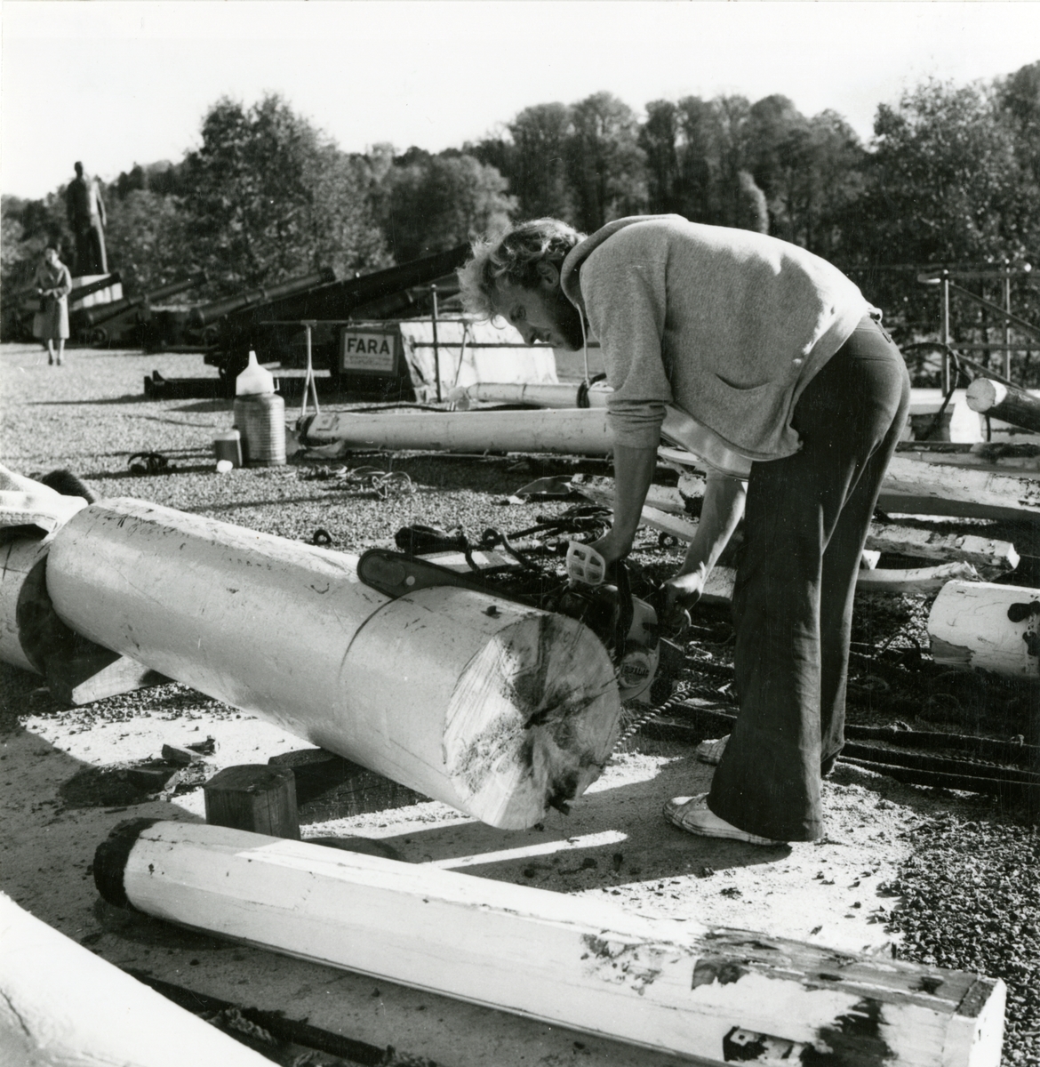 Uppsågning av Gladans mast vid Sjöhistoriska museet.
