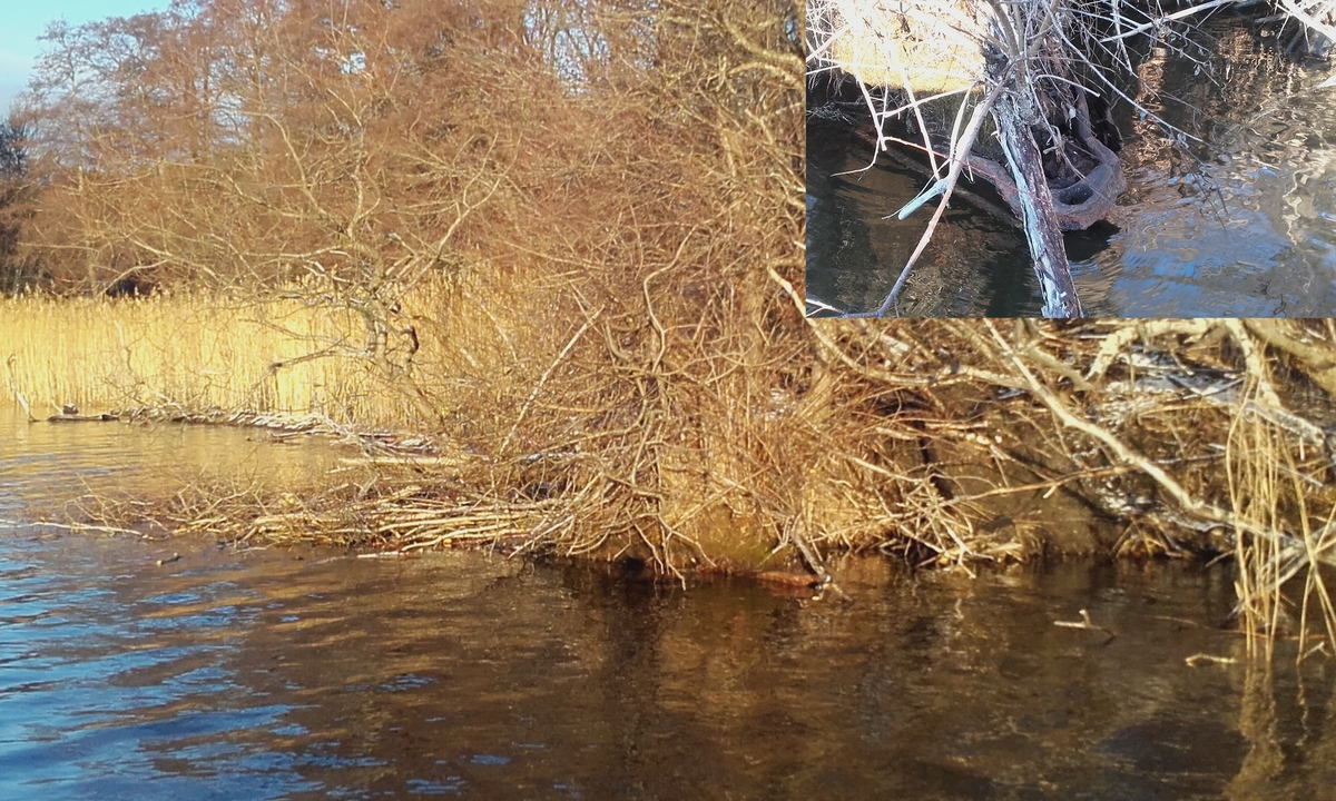 Fartygslämningen Bro 311 (ID 12) ligger i vattenytan till vänster i bild. I förgrunden syns rester av en möjlig äldre kaj/brygga. Infogad förstoring visar en förmodad järndetalj i en äldre övervuxen kajkonstruktion eller tillhörande Bro 311.