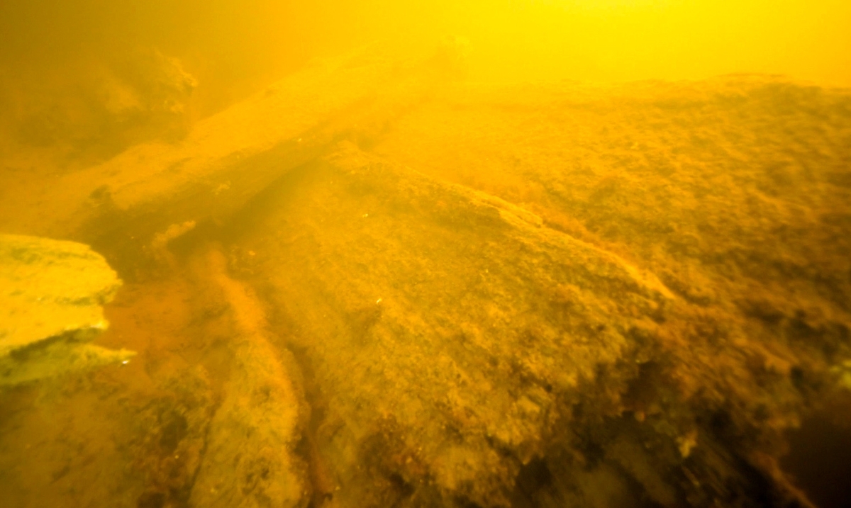 Bilden visar en fartygslämning. Man ser bordläggning och klinkhak. . Lämningsnummer L2020:1811.