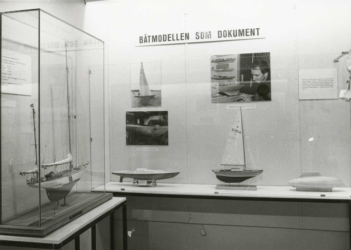 Utställningen "Från predikstol till vindstrut". Monter som visar "Båtmodellen som dokument". Modellbygge av segelbåtsmodellerna BARRACUDA II, VEGA, Nordisk Folkbåt m.m.