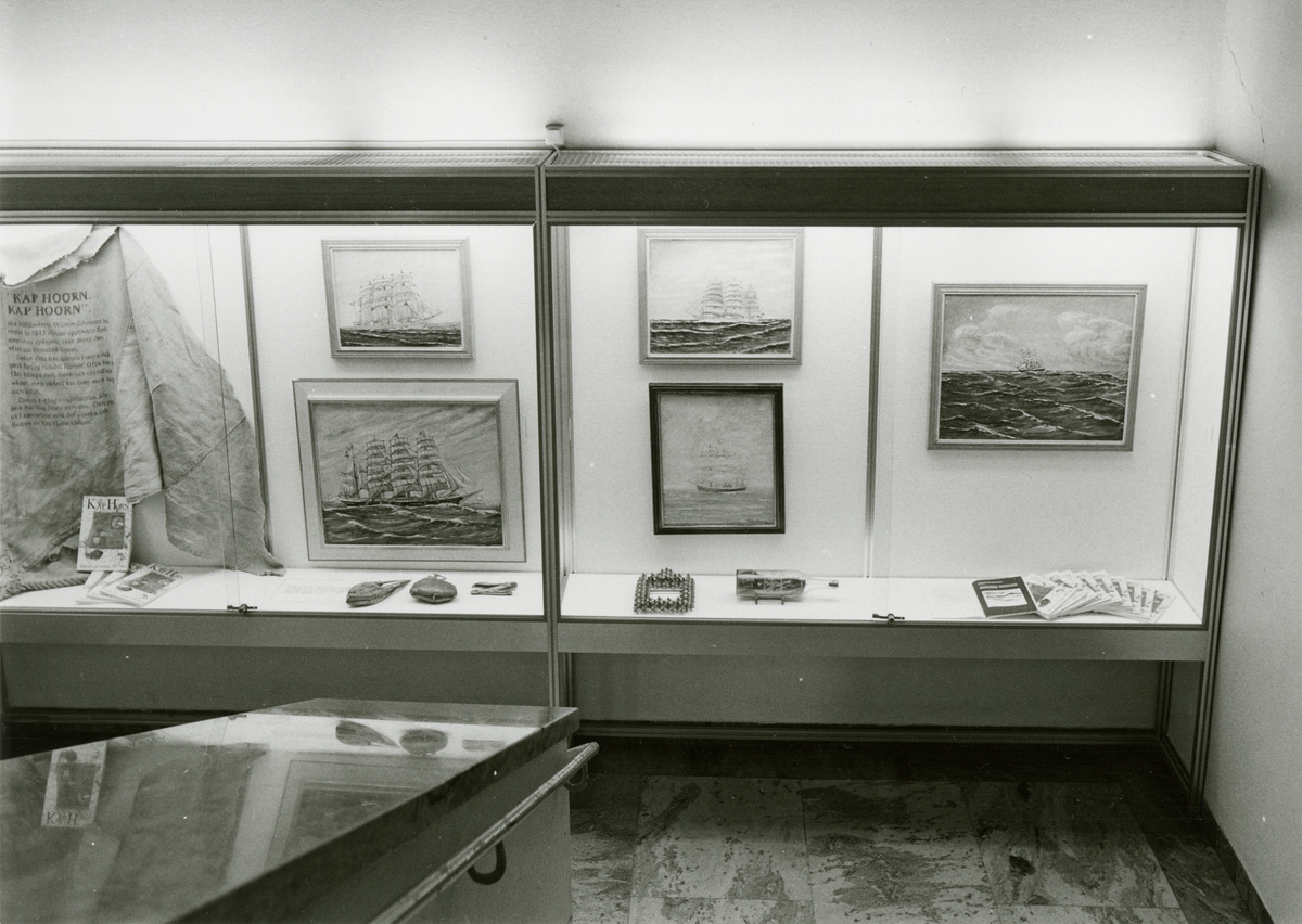 Utställningen "Kap Horn" i trappmonter. Utställning i samband med temat Kap Horn i Sjöhistoriskas årsbok. Konst och föremål kopplade till ämnet.