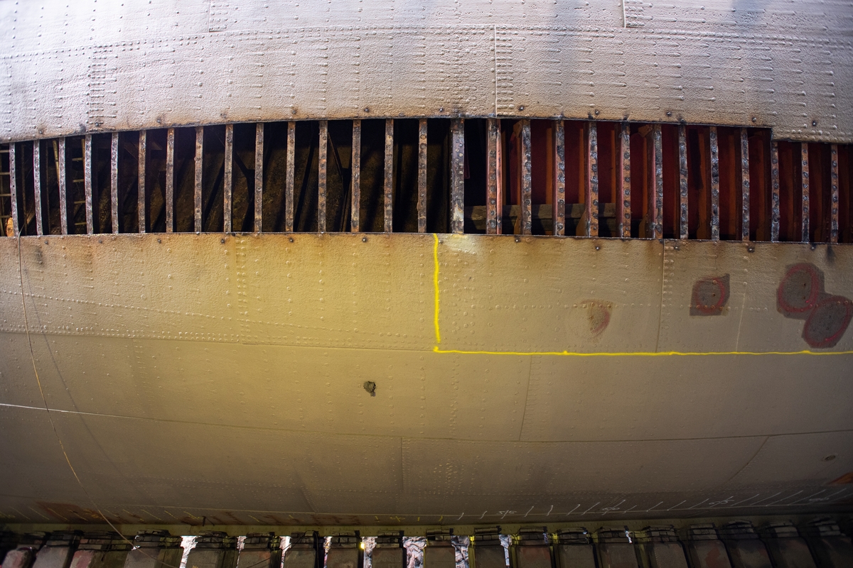 Isbrytaren SANKT ERIK på Stockholms Reparationsvarv, Beckholmen. Detalj av skrovet med blottlagda spant efter att rostskadade plåtar avlägsnats.