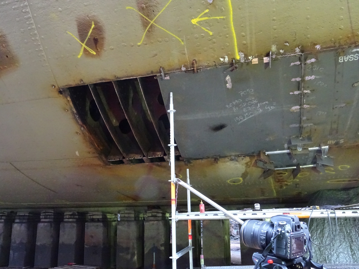 Isbrytaren SANKT ERIK på Stockholms Reparationsvarv. Ersättningsplåtar har svetsats fast i skrovet.