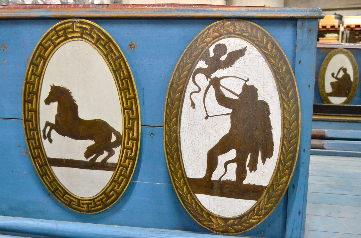 Sköldar med antika motiv på den kungliga slupen GALTEN i Sjöhistoriska museets båthall på Rindö.