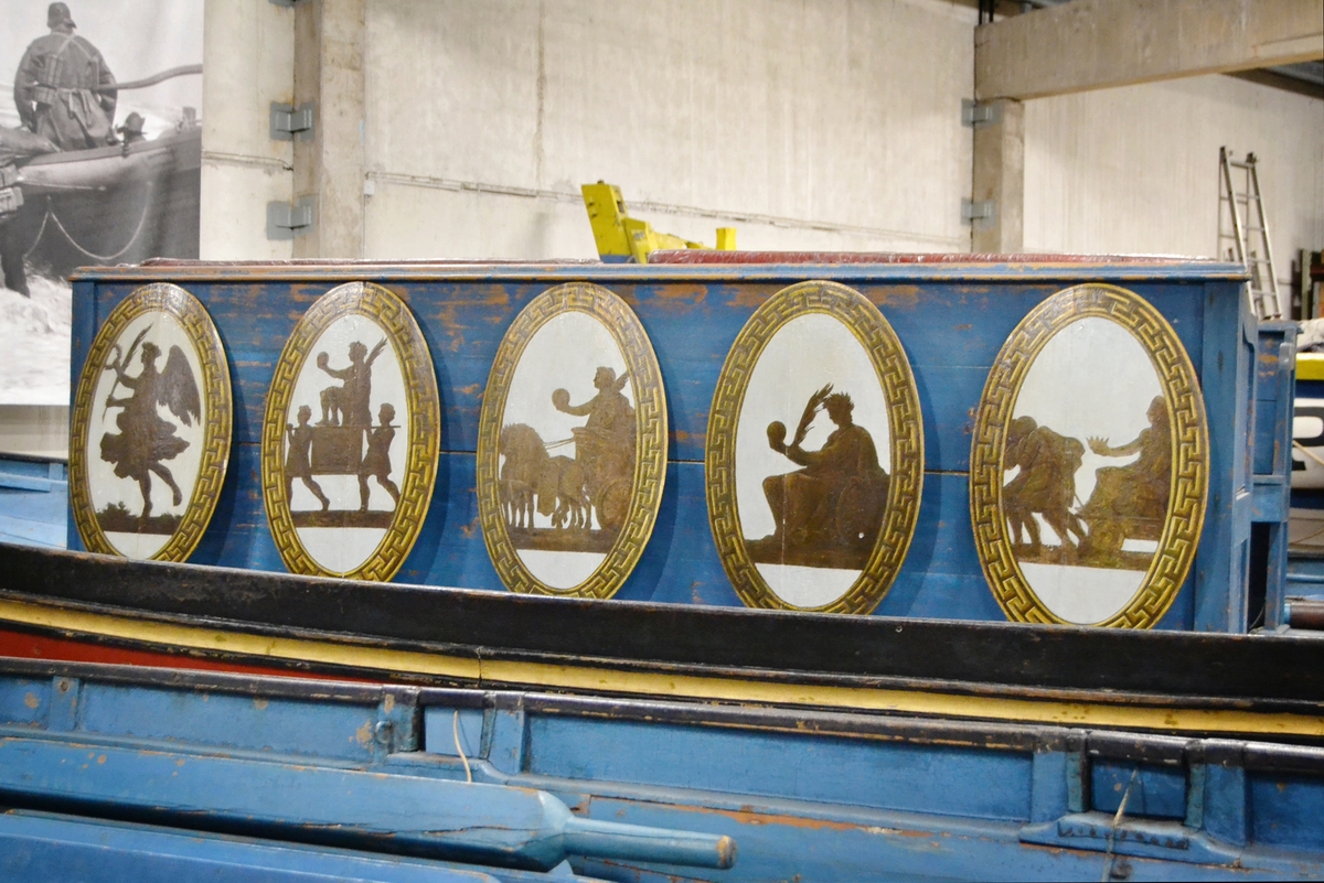 Sköldar med antika motiv på den kungliga slupen DELFINEN i Sjöhistoriska museets båthall på Rindö.