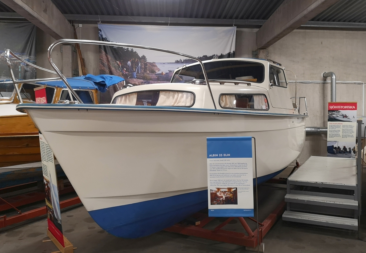 Titel: Motorbåten ELIN i Sjöhistoriska museets båthall på Rindö.