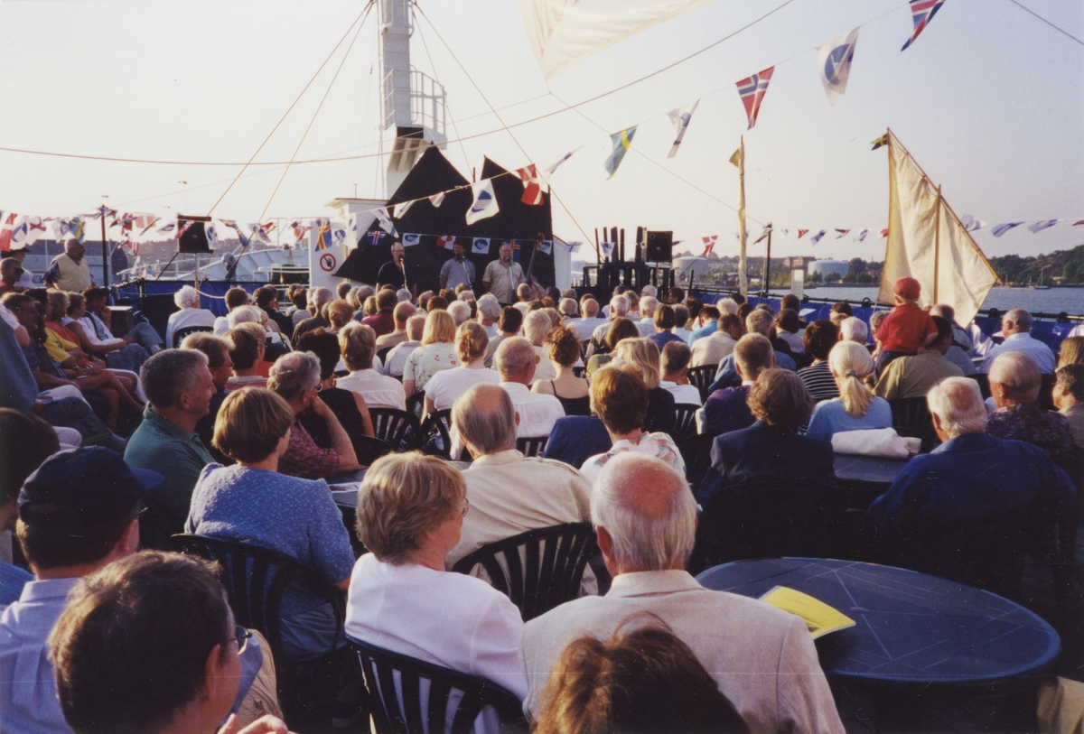 Utställningen "Människor och båtar i Norden". Tre stycken talare samt ett publikhav på däcket av fartyget M/S NORDWEST.