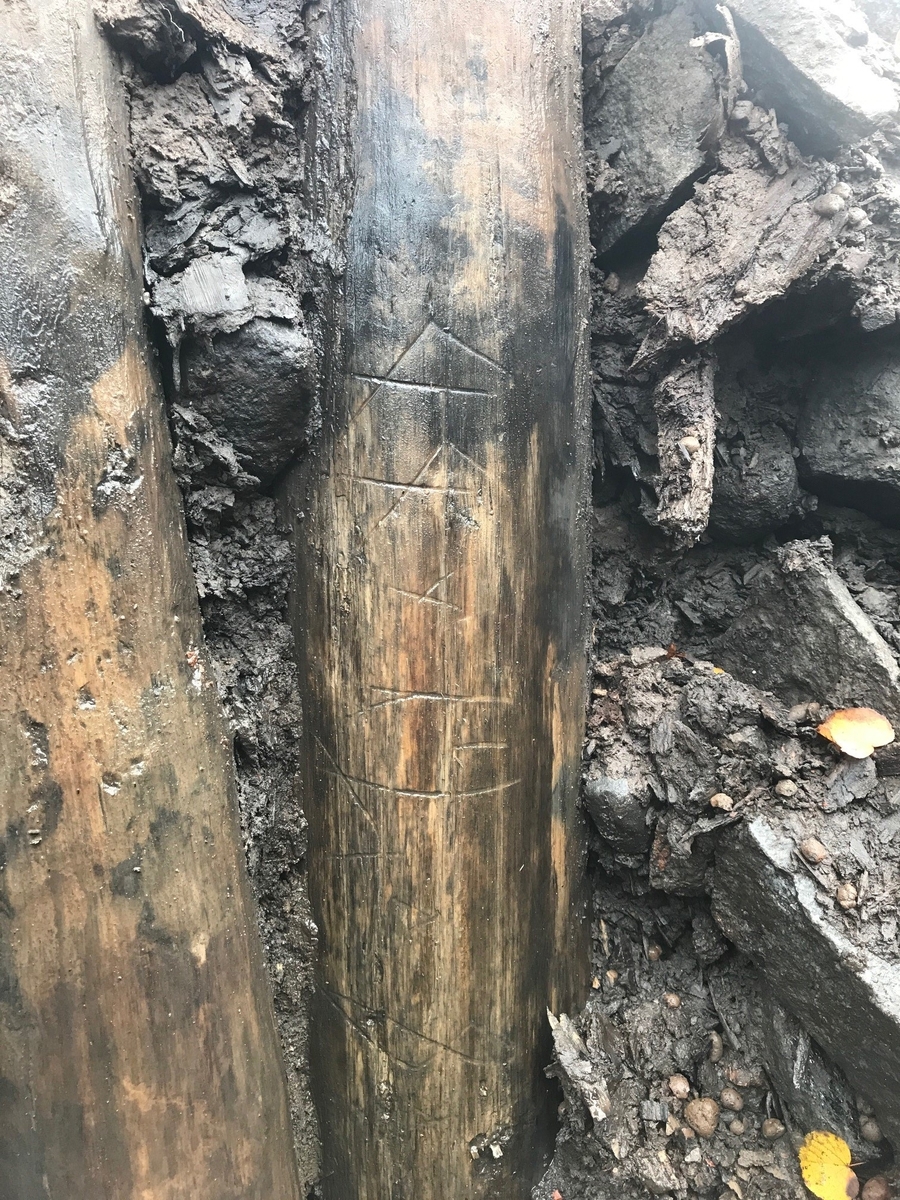 Bilderna visar de två pålar som framkom i grop nummer 7. En in situ och den andra som drogs upp och därefter dokumenterades. Den senare dokumenterades i 3D.