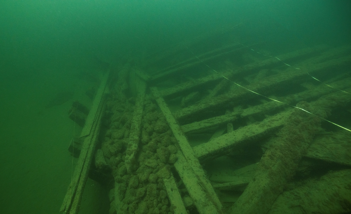 Babordssidan lutar kraftigt ned mot sjöbotten. Däcksbalkarna sitter på flera ställen på sina