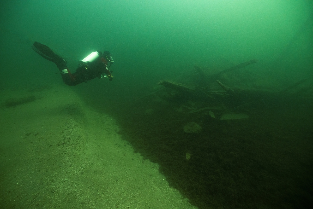 Vraket ligger nära en lerkant (under arkeologen i bilden) som vetter upp mot V6. Akterstäven syns peka