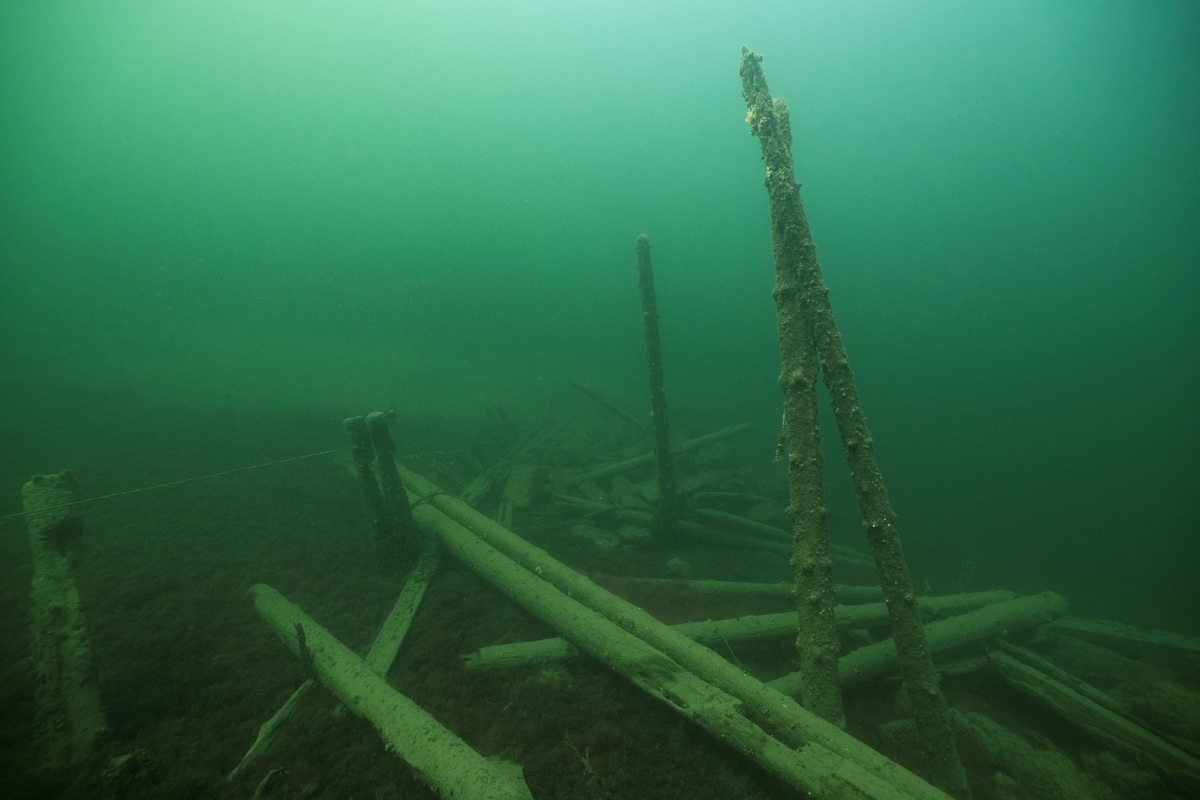 På bilen syns de konstruktioner som påförts innan sänkningen. Skarvarna på de runda timren visar
