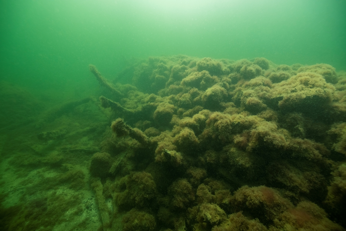 Vraket är täckt med sten. Bilden är tagen från fören mot aktern.