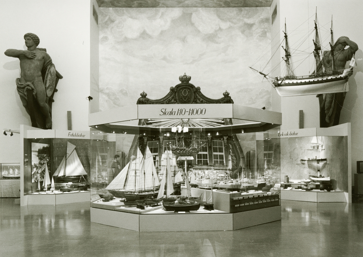 Utställningen "Modellutställningen" i Minneshallen. Överblicksbild. Montrar visande "Fritidsbåtar", "Skala 1:10-1:1000" och "Leksaksbåtar"
