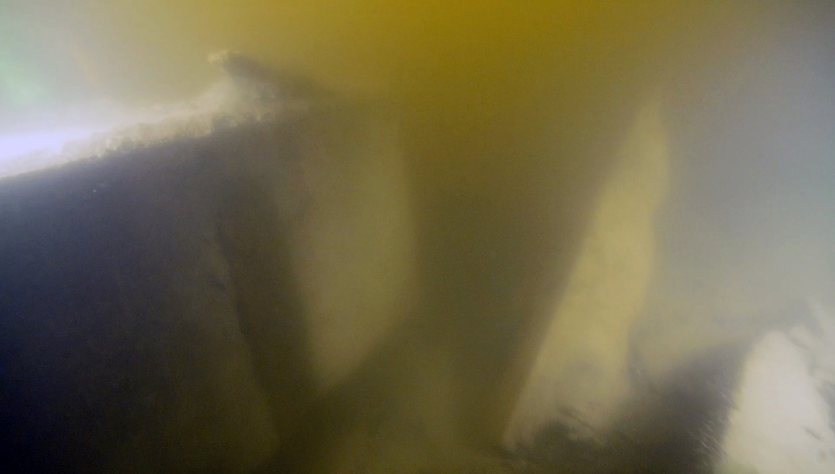 Till vänster i bilden syns bojstenen tydligt stå bredvid skeppsdelar i vraket.