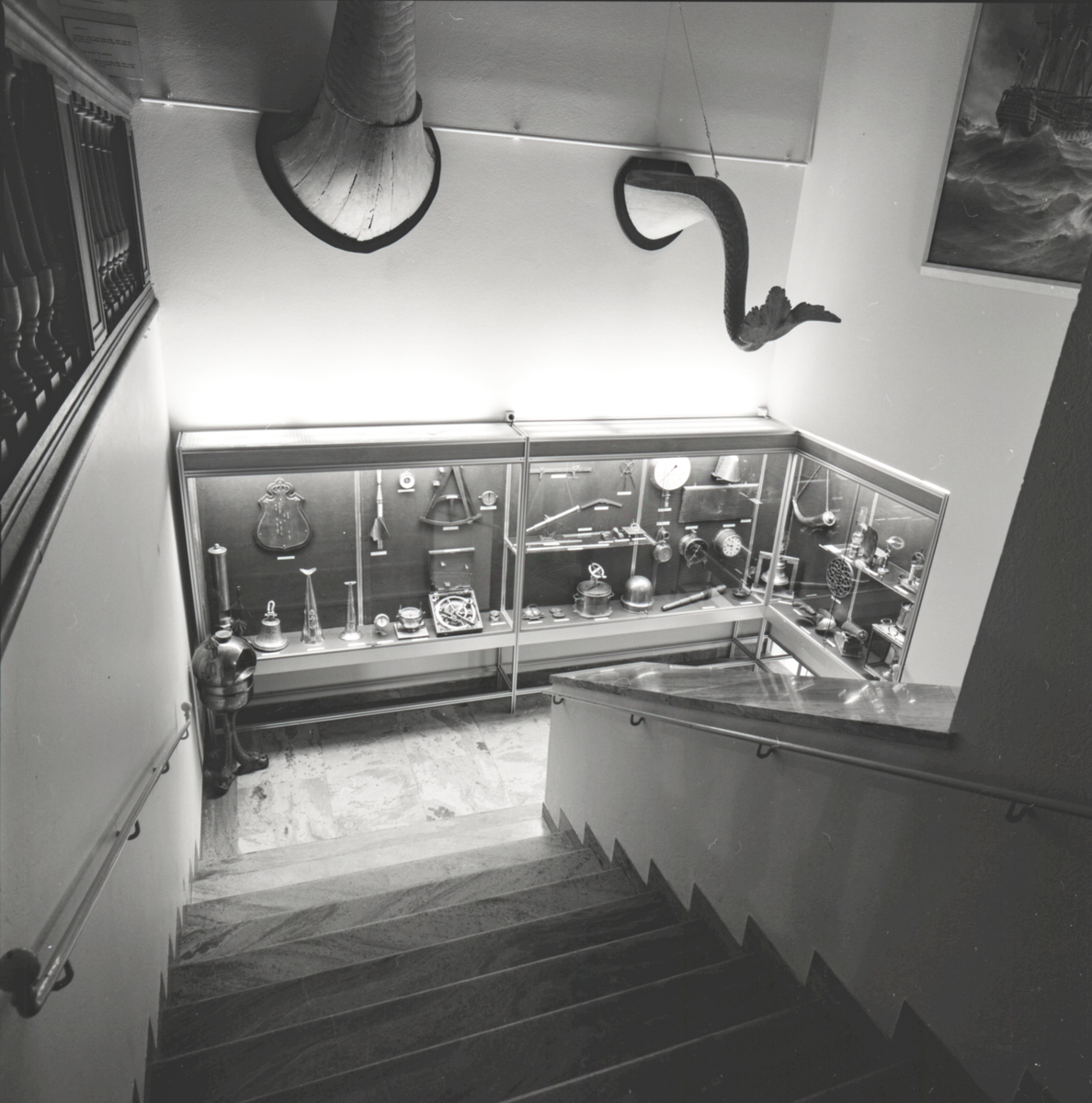 Utställningen "Mässing". Utställning i trappmonter. Nautiska föremål av mässing t.ex. ropare, skeppsklocka, nakterhus och navigationsinstrument visas.