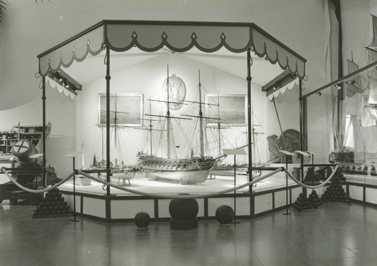 Utställningen "Flottans paviljong". Överblicksbild av utställningen i minneshallen.