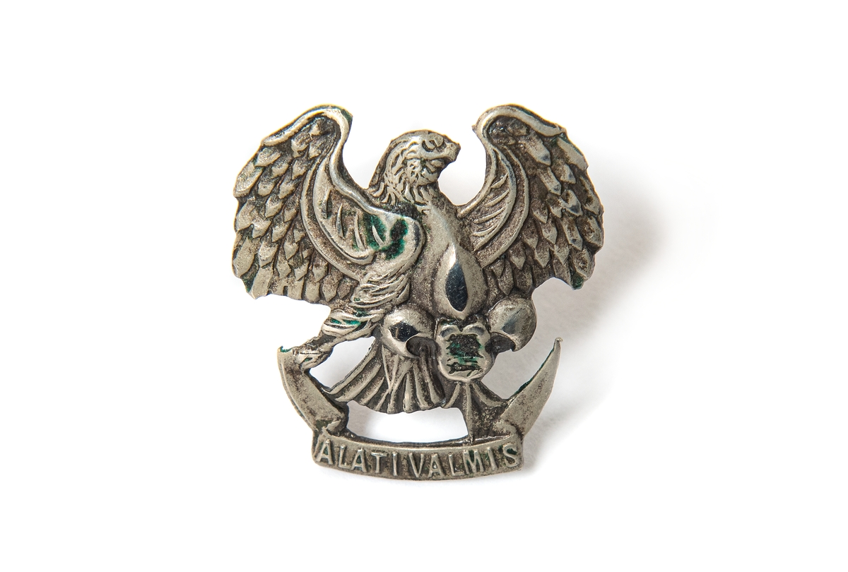Estniskt scoutmärke: Örnformad brosch, med texten "Alati Valmis". Togs med på flykt från Estland år 1944.