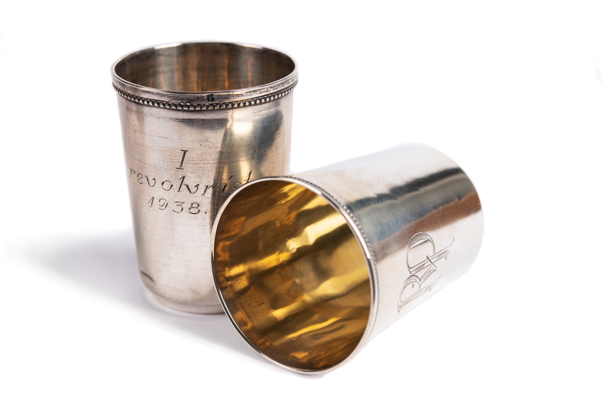 Silverfärgade bägare med ingravering. Delades ut som pris i skjutövningar i Estland på 1930-talet. Togs med på flykt från Estland till Sverige år 1944.