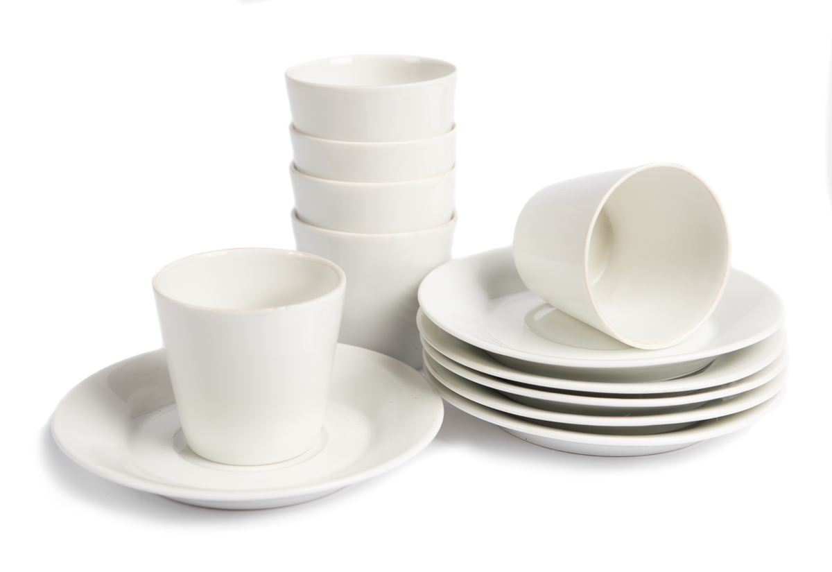 Vita porslinskoppar utan öra och fat som togs med på flykt från Estland till Sverige år 1944.